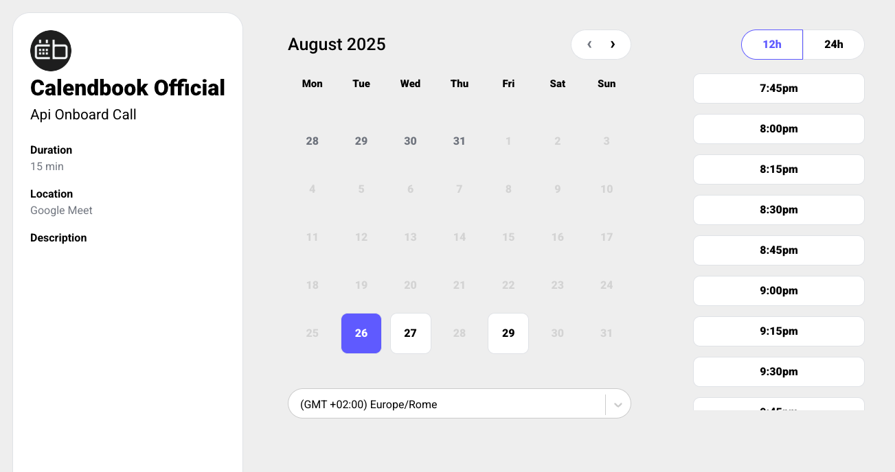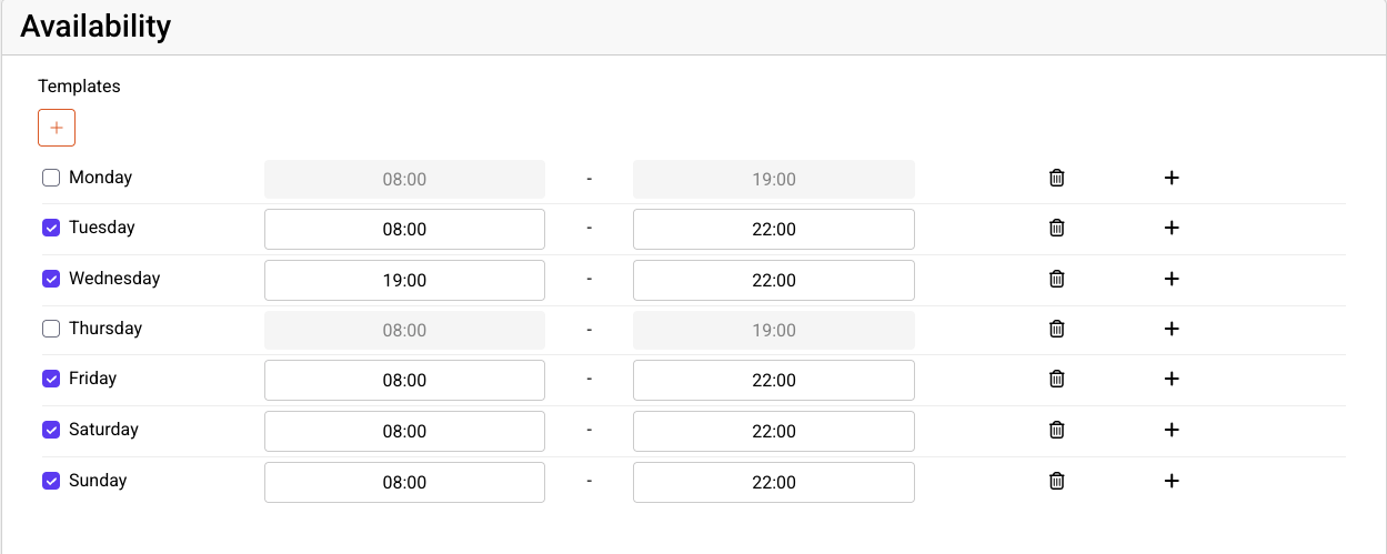 - Weekly recurring availability (e.g. Mon–Fri 9:00–17:00)