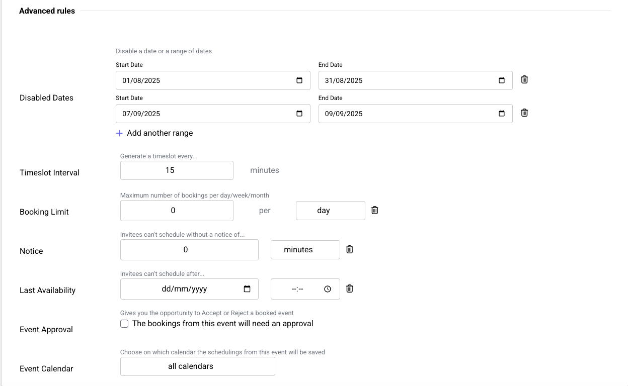 Event Availability defines the time ranges when an event can be scheduled.It is configured per event and can include: